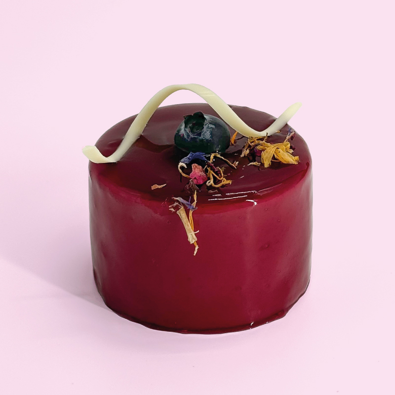 Eine zarte Jasminblütenmousse, verfeinert mit einem Heidelbeerkern, einem weißen Schokocrunch und einem Mandelbiskuit.
