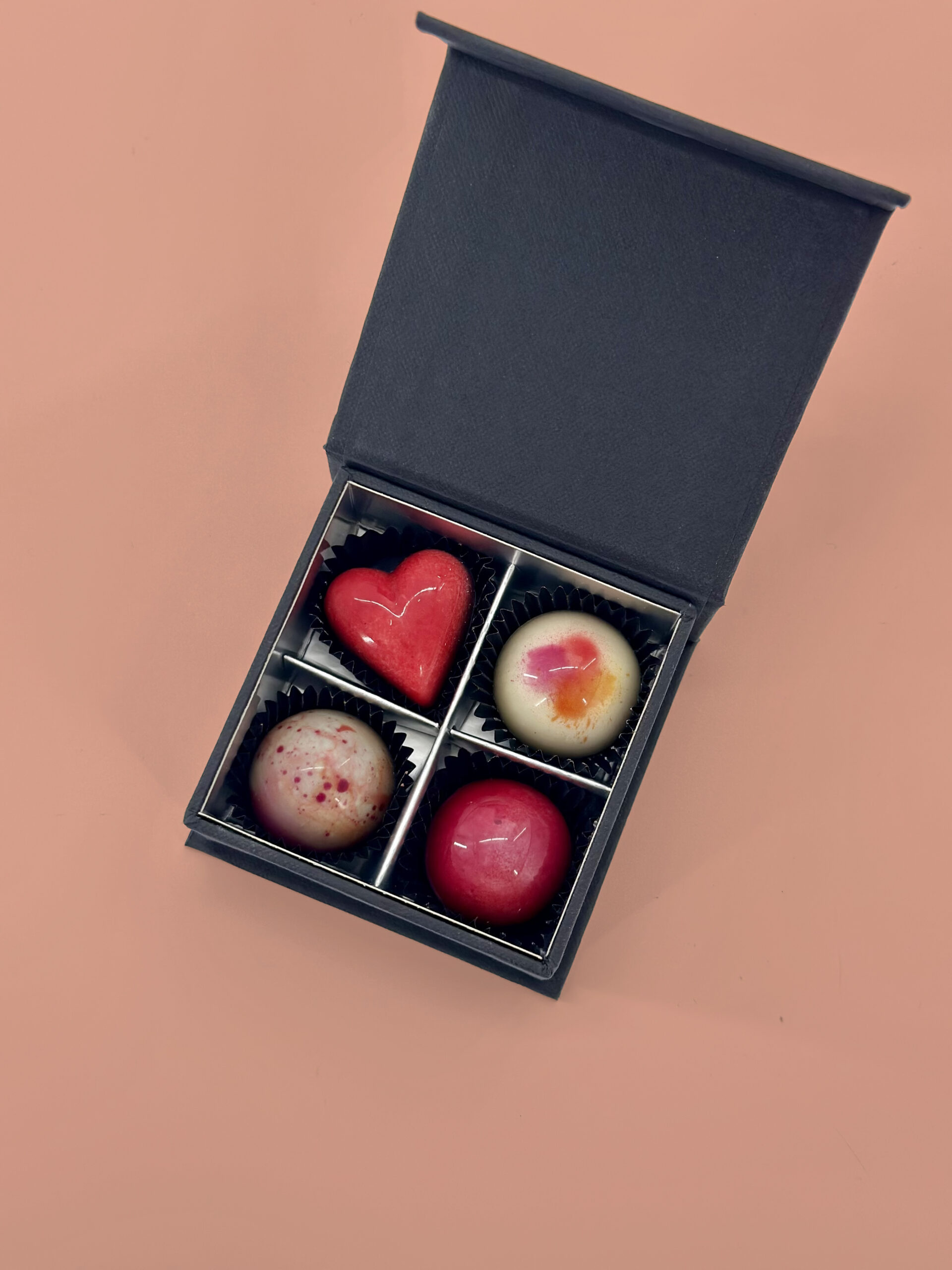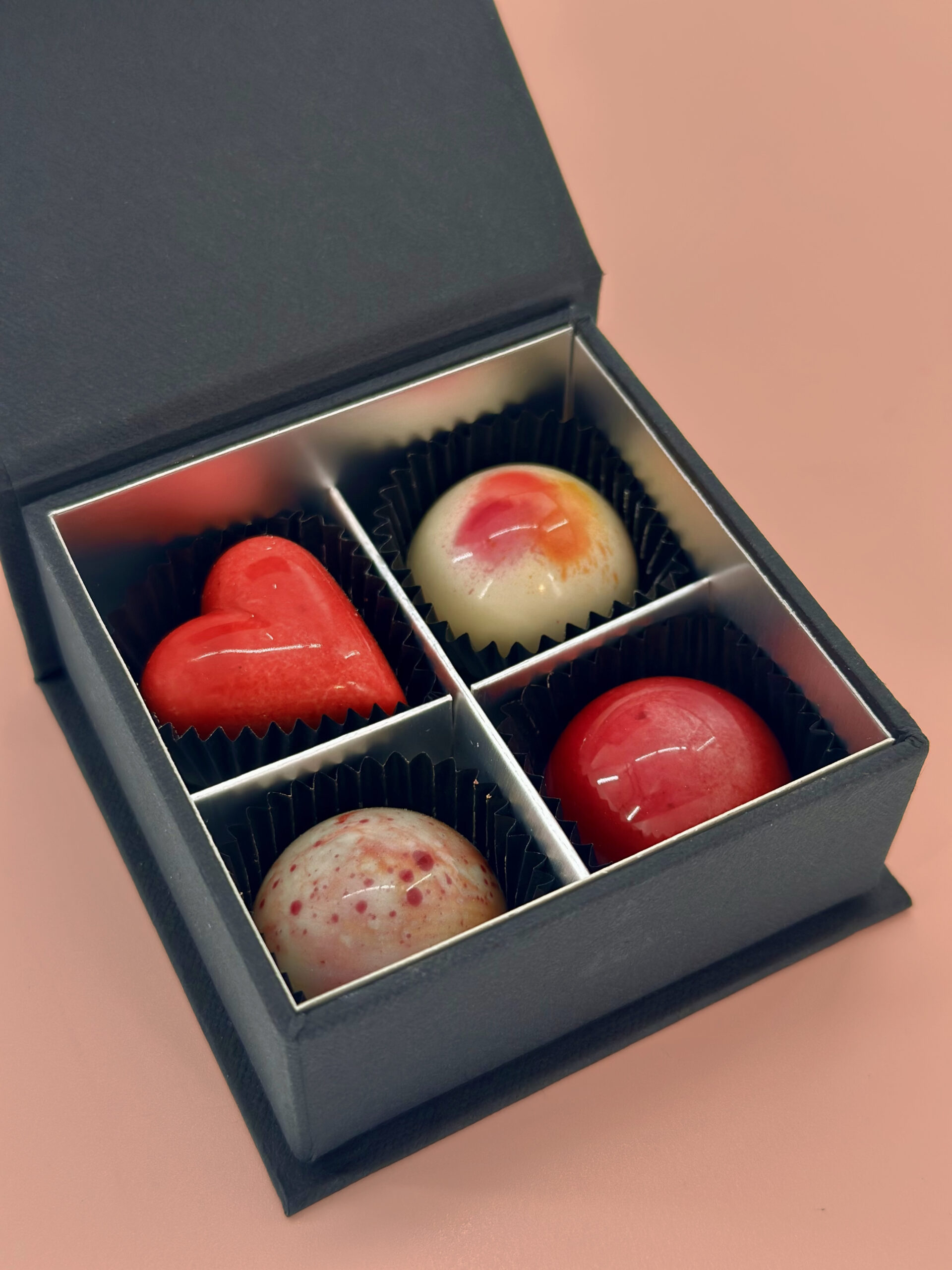 Sag es mit Schokolade: Unsere exklusive Valentinstags-Kollektion vereint vier handverlesene Pralinen-Kreationen, die Herzen höher schlagen lassen.