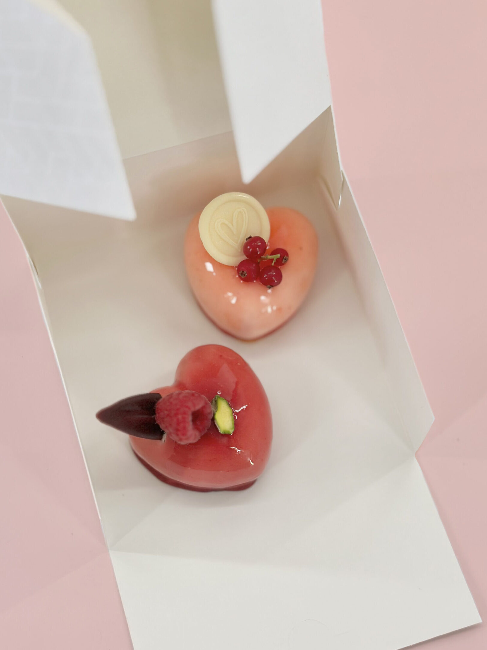 Unsere Valentinstagsbox ist gefüllt mit zwei leckeren Törtchen in Herzform: