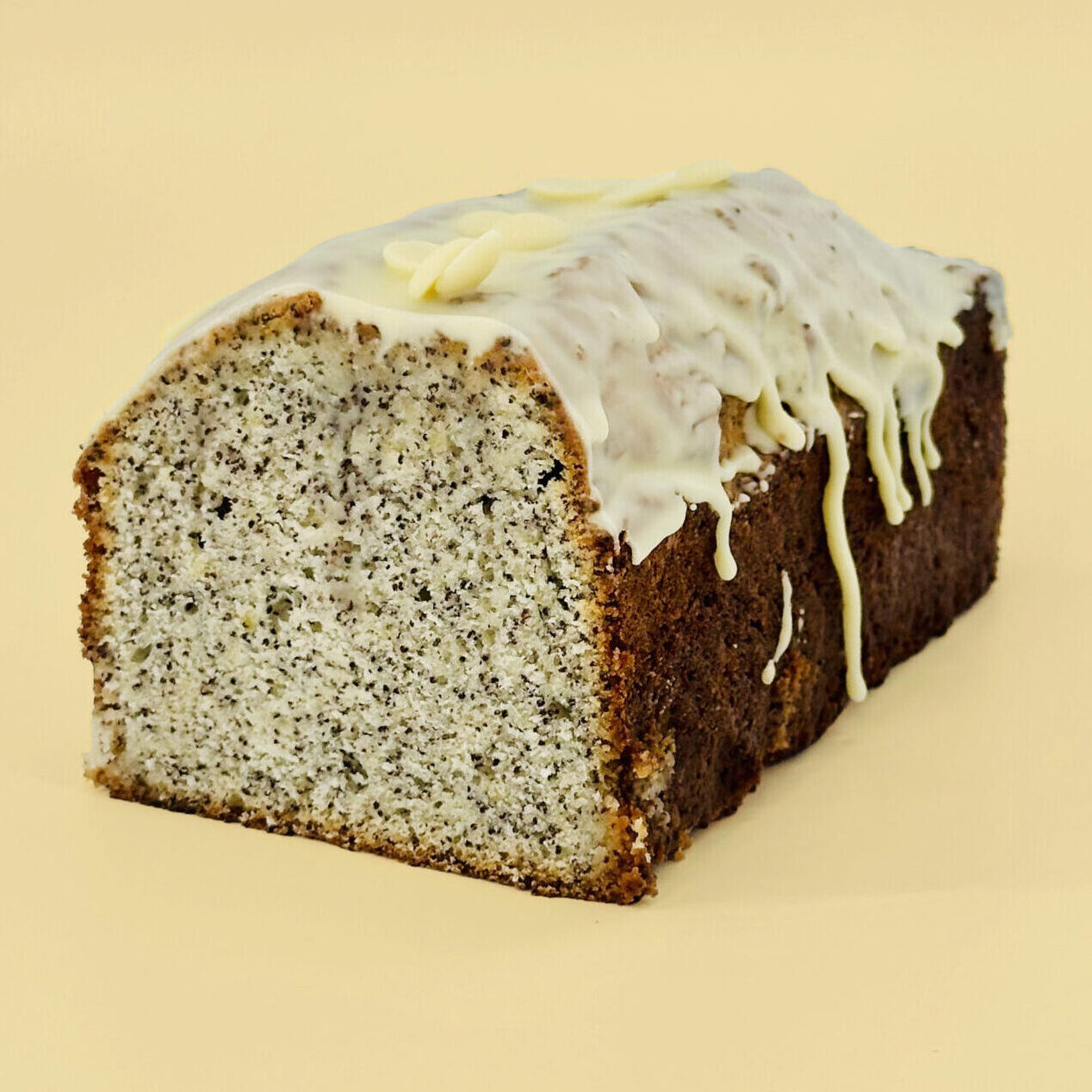 Ein luftig gebackener Kuchen mit erfrischender Zitronennote, feinem Mohn und weißer Schokoladenglasur. Locker, zart und saftig, fast schon fluffig.